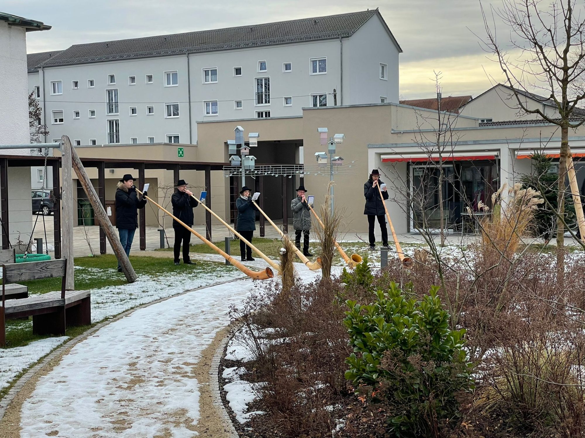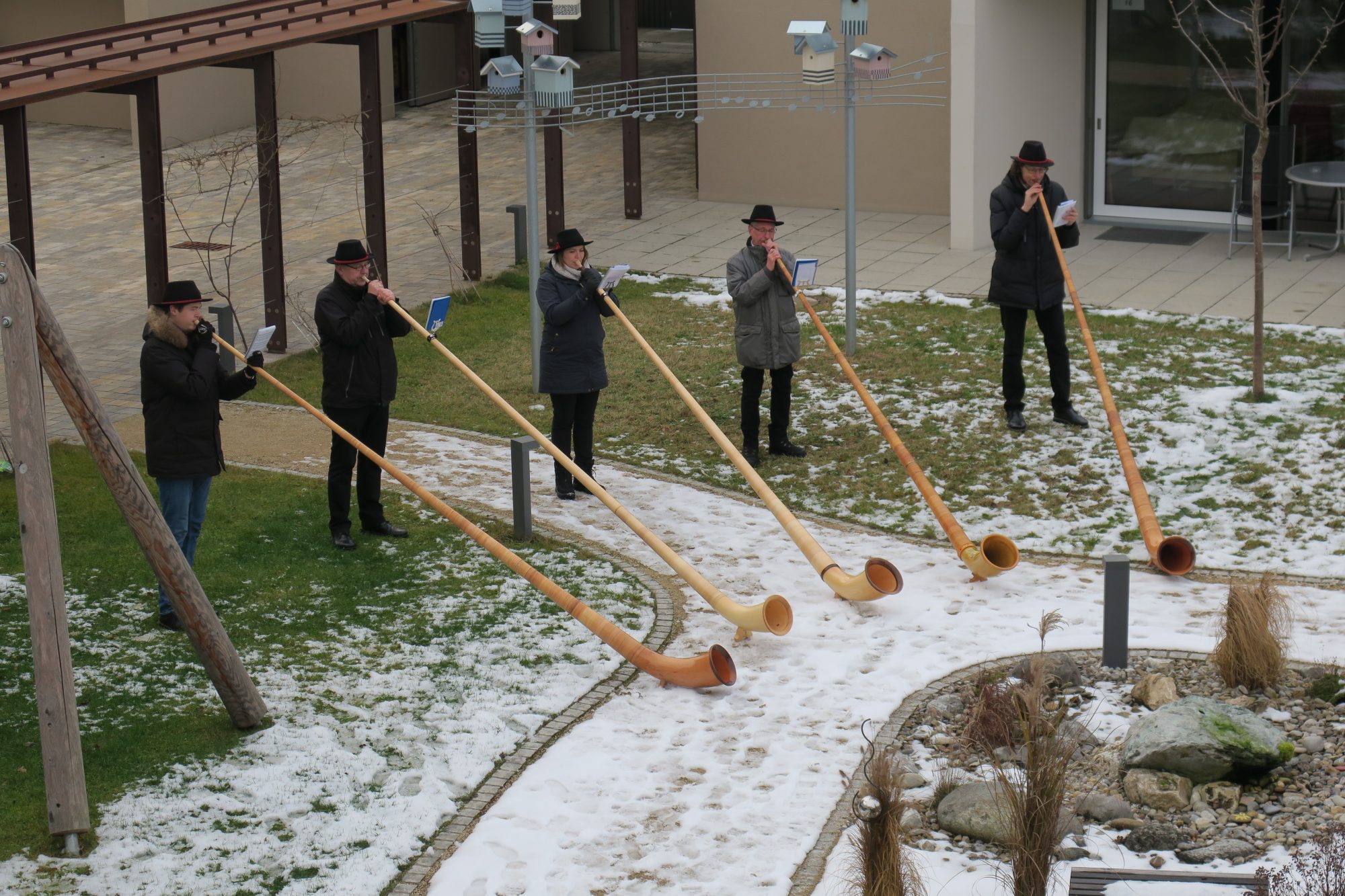 Das war eimmal etwas ganz Besonderes: am 12.12.2021 statteten uns die Loderberger Alphornbläser einen Besuch ab und bespielten den Garten mit ihren teils besinnlichen, teils beschwingten Stücken. Gäste, Angehörige und Mitarbeiter hörten vom Garten oder den Terrassen aus zu. Gregor Tiedeken, einer der Bläser, sagt: “ Wir freuen uns sehr, dass wir im Garten des St.-Vinzenz-Hospizes musizieren durften und hoffen, den Gästen mit unseren Alphörnern Freude bereitet und sie bestenfalls mit den Naturtonklängen emotional zu berührt zu haben“. Wir sind uns sicher, dass man die Musik auch weithin in der Nachbarschaft noch gehört hat, denn solche Alphörner haben schon eine gewisse Reichweite – und somit waren bestimmt nicht nur die Zuhörer des Hospizes berührt von diesen wunderschönen Tönen.