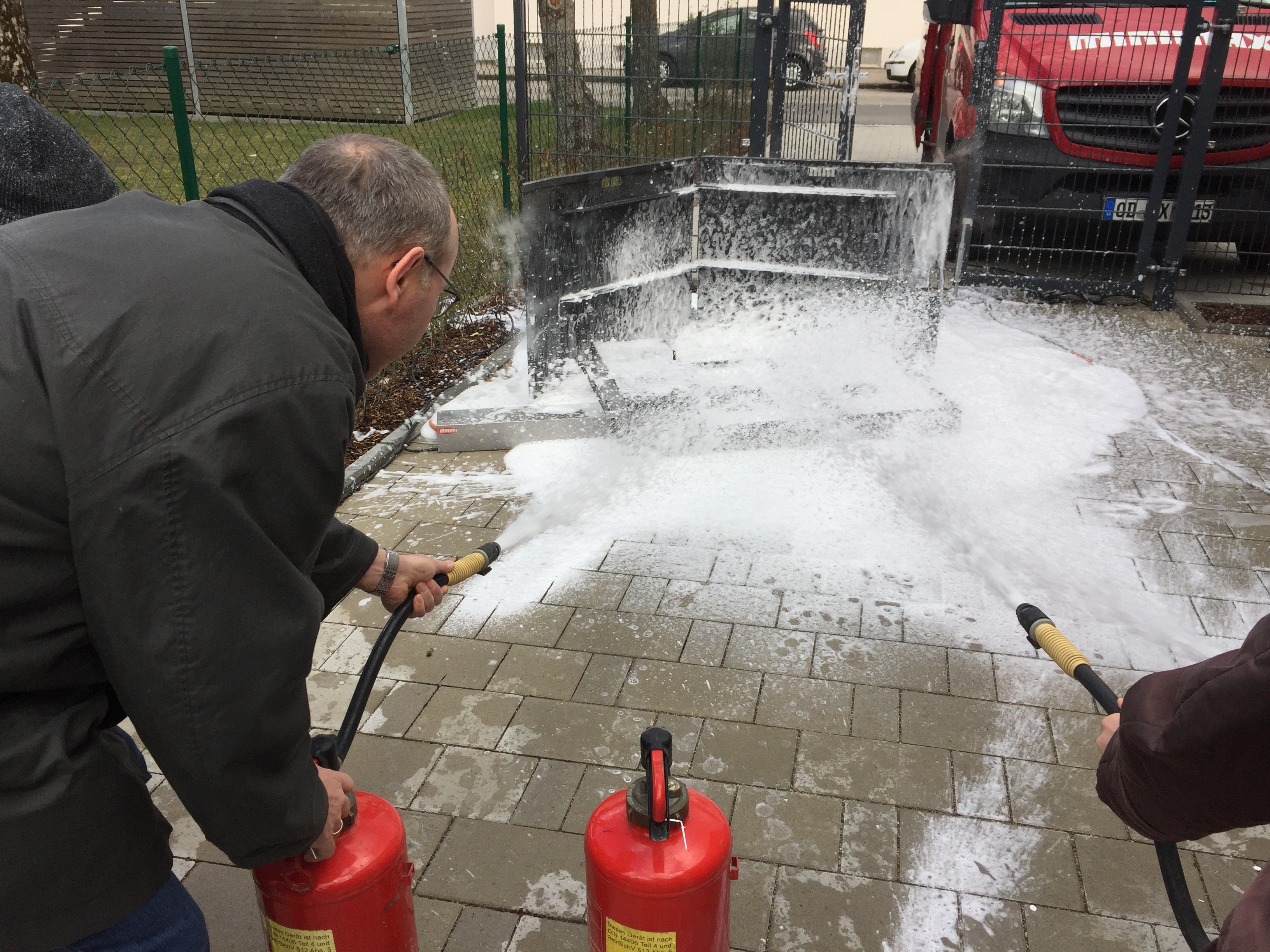 Alles wurde ausprobiert: Wasserlöscher, CO²-Löscher und natürlich die Pulverlöscher, die das Übungsgelände im Außenbereich in eine Schaumparty-Meile verwandelten. Es erinnerte alles ein wenig an den Physikunterricht in jungen Jahren, als praktische Übungen zur Auflockerung des Unterrichts sehr beliebt waren, aber der „Lehrer“ in Person von Herrn Menzinger die Kontrolle darüber behielt, wie lange der Spass bzw. der Ernst dauern sollte. Manuell steuerte er Brandlänge und –intensität des Übungsfeuers und verhalf somit allen zu einem Erfolgserlebnis und dem erhebenden Gefühl, eine begnadeter Feuerwehrmann bzw. –frau zu sein.
